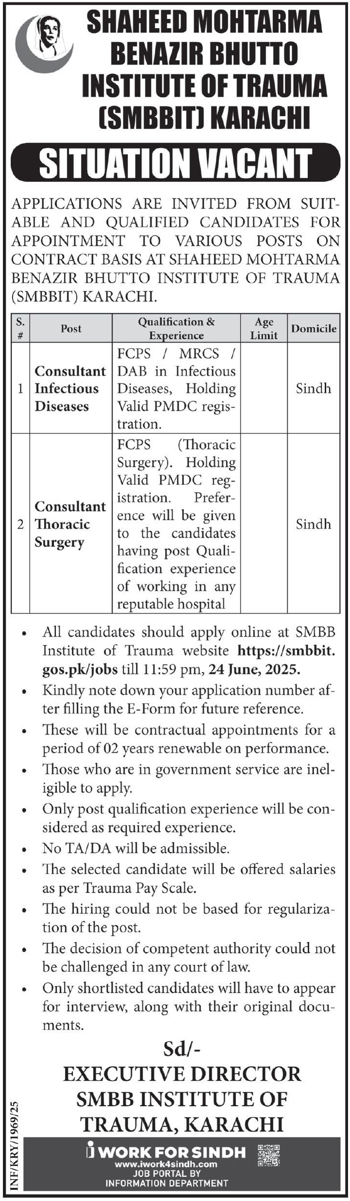 Shaheed Mohtarma Benazir Bhutto Institute of Trauma SMBBIT jobs advertisement dated about 15 June 2025 in daily Express Tribune Newspaper invites application for the vacant post of consultant thoracic surgery and consultant infectious diseases in Karachi, karachi Sindh Pakistan. Persons with MBBS etc. education can apply.