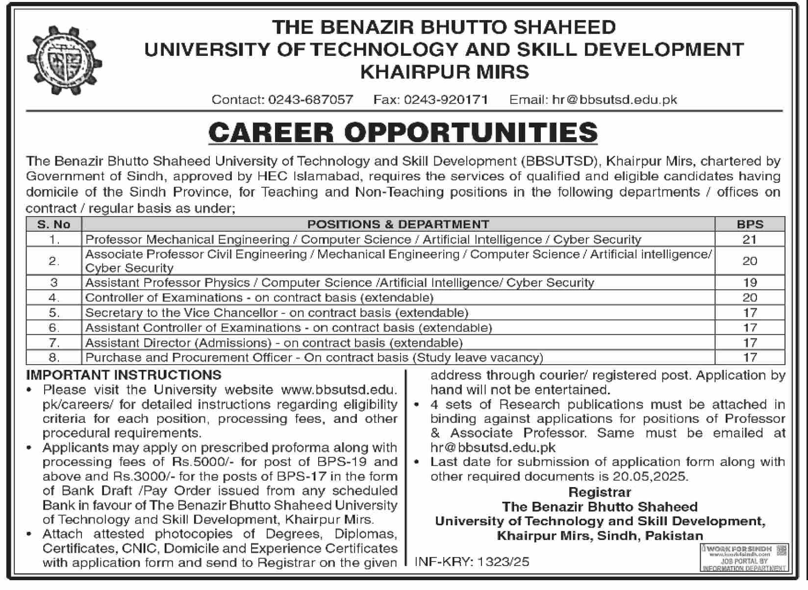 Benazir Bhutto Shaheed University of Technology & Skill Development Khairpur, khairpur Sindh Pakistan invites applications from eligible candidates for the post of purchase procurement officer, assistant controller of examination, assistant director admissions, secretary to the vice chancellor, assistant professor, associate professor, controller of examinations and professor as per advertisement of April 26, 2025 published in daily Dawn Newspaper. Preferred Education is Master, Bachelor, Mphil, Phd and MS etc.