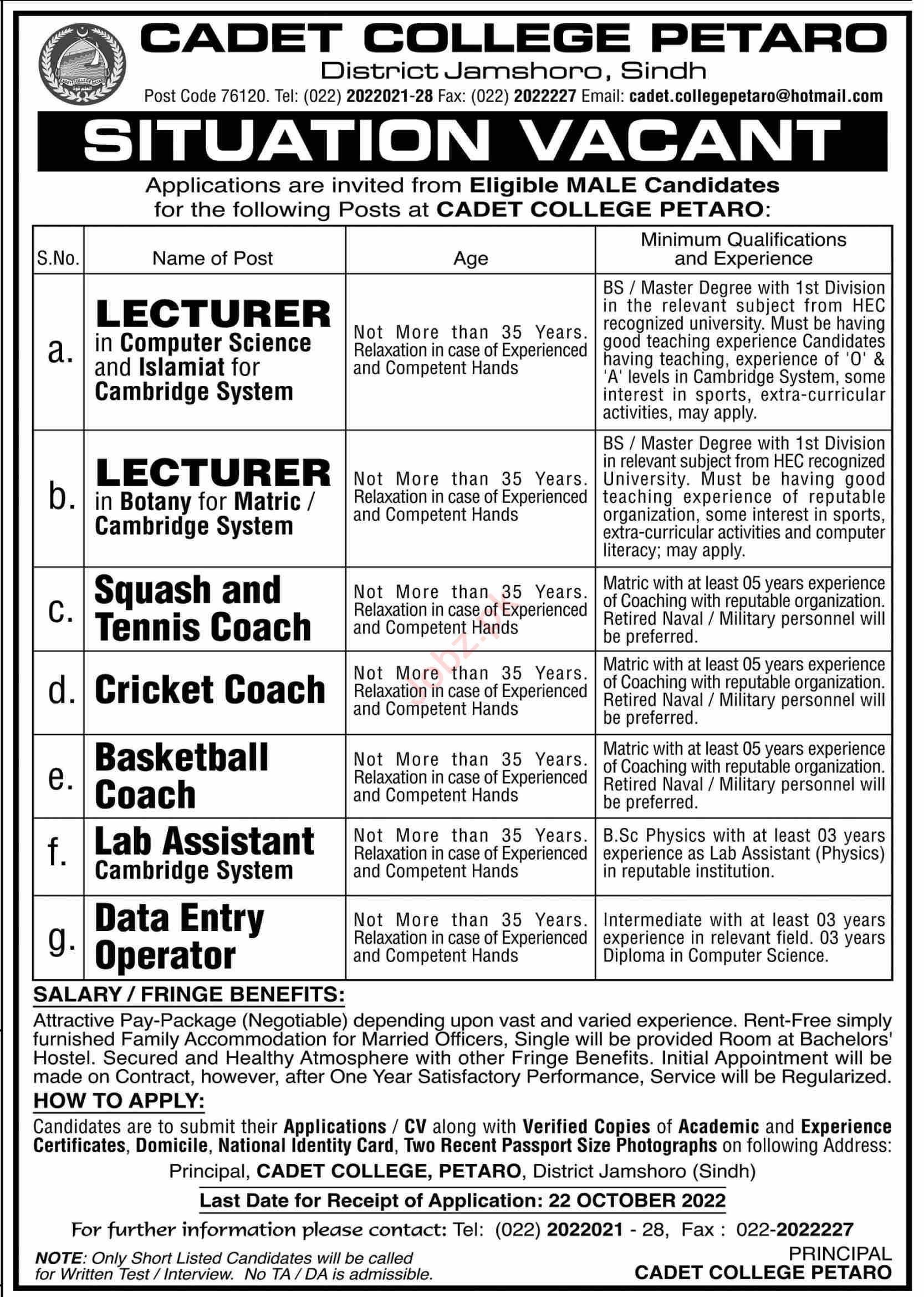 Cadet College Petaro Jamshoro, jamshoro Sindh Pakistan invites applications from eligible candidates for the post of lab assistant, cricket coach, lecturer botany, basket ball coach, squash tennis coach, data entry operator and lecturer computer science as per advertisement of October 10, 2022 published in daily Dawn Newspaper. Candidates with Matric, Master and Intermediate etc. educational background will be preferred.