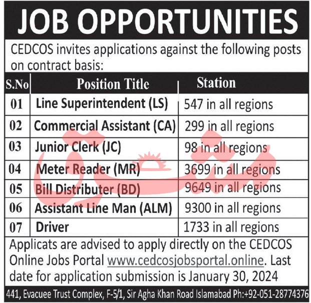 CEDCOS jobs advertisement dated about 15 January 2024 in daily Mashriq Newspaper invites application for the vacant post of Bill Distributor, Clerk, Driver, Assistant Line Man, Meter Reader, Line Superintendent and Commercial Assistant in Islamabad, islamabad Islamabad Pakistan. Candidates with Intermediate, Matric, Bachelor and Middle etc. educational background will be preferred.