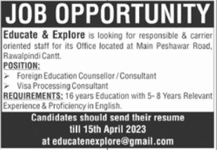 Educate & Explore Rawalpindi, rawalpindi Punjab Pakistan invites applications from eligible candidates for the post of foreign education counsellor, visa processing consultant and consultant as per advertisement of April 2, 2023 published in daily Jang Newspaper. Candidates with Bachelor and Master etc. educational background will be preferred.