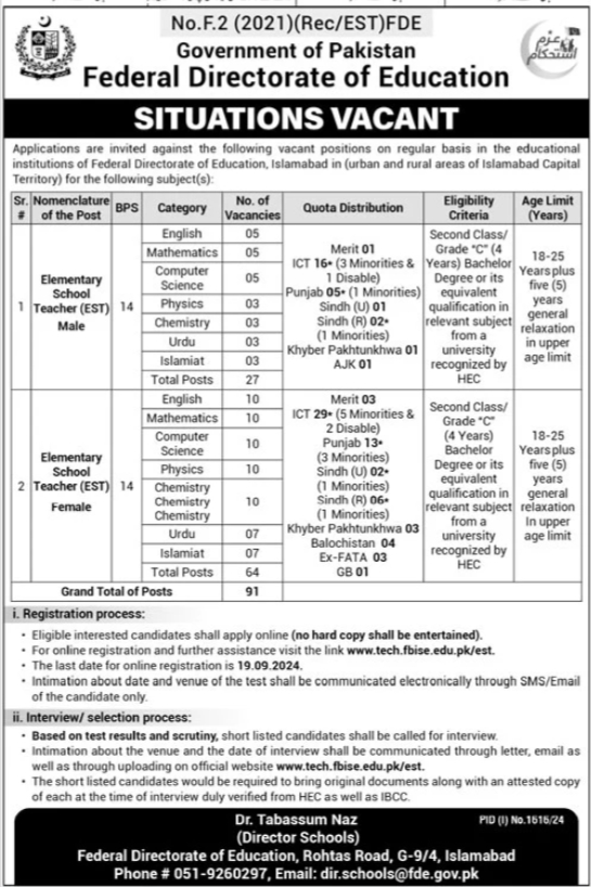 Vacant posts including computer science teacher, islamiat teacher, english teacher, mathematics teacher, physics teacher, urdu teacher, elementary school teacher est and chemistry teacher are announced in Federal Directorate of Education FDE Islamabad, islamabad Islamabad Pakistan as per 4 September 2024 advertisement in daily Jang Newspaper. Candidates with Bachelor and Master etc. educational background will be preferred.
