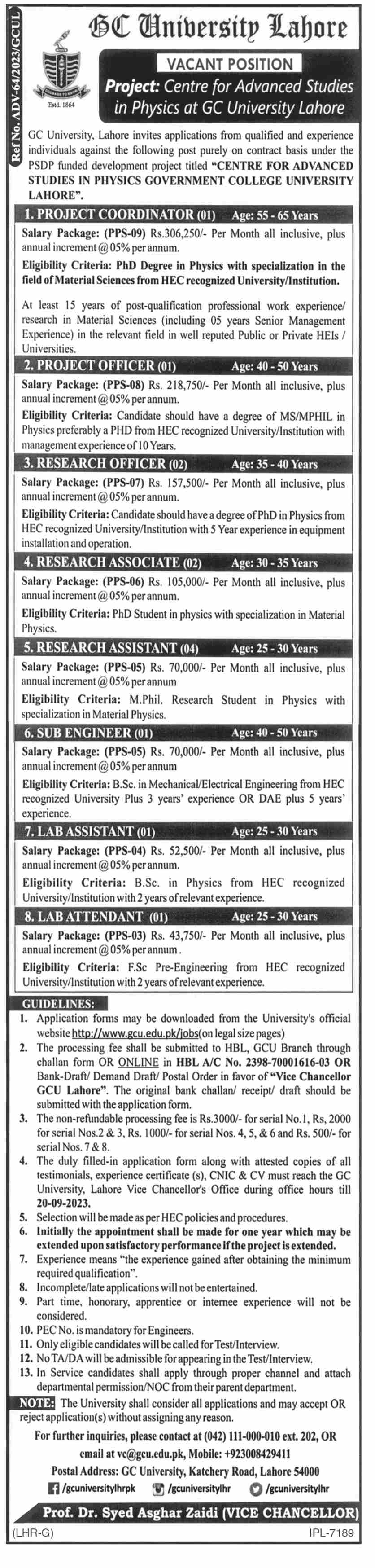 Vacancies in GC University Advertisement September 2023