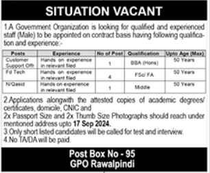 Government Organization jobs advertisement dated about 3 September 2024 in daily Jang Newspaper invites application for the vacant post of customer support officer, fd tech and naib qasid in Rawalpindi, rawalpindi Punjab Pakistan. Educational qualifications required BBA, Middle and Intermediate etc.