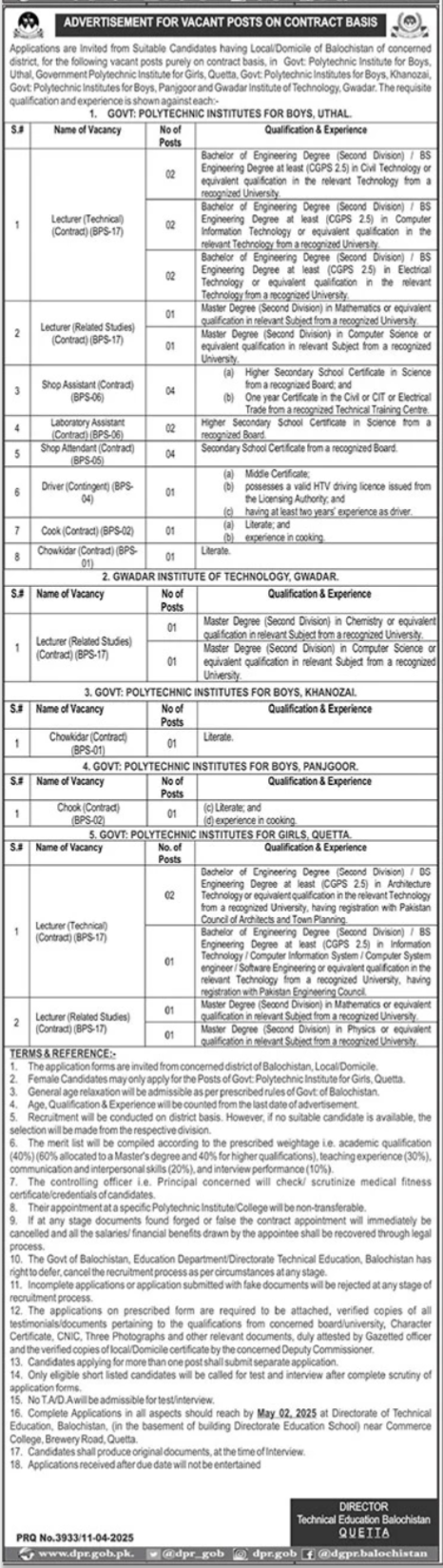 Vacant posts including laboratory assistant, lecturer related studies, lecturer, lecturer technical, shop assistant, shop attendant, chowkidar, driver and cook are announced in Government Polytechnic Institute Quetta, gwadar, quetta, lasbela and panjgur Balochistan Pakistan as per 12 April 2025 advertisement in daily Jang Newspaper. Educational qualifications required Master, Bachelor, Intermediate, Middle and Primary etc.