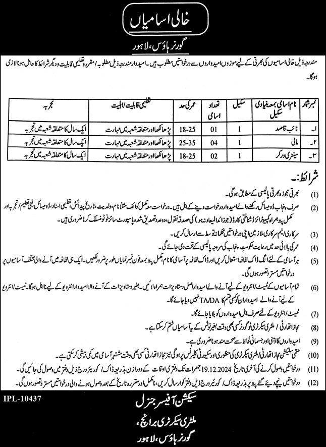Governor House is looking for candidates for following posts as per job advertisement published in daily Express Newspaper of December 6, 2024 for location Lahore, lahore Punjab Pakistan: