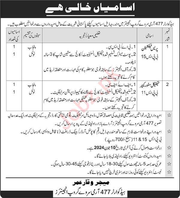 Vacant posts including technical store keeper and press technician are announced in Pakistan Army Rawalpindi, rawalpindi Punjab Pakistan as per 26 May 2024 advertisement in daily Nawaiwaqt Newspaper. Educational qualifications required Intermediate and BA etc.