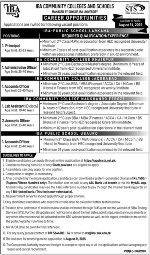 Vacant posts including principal, accounts officer, lab assistant and administrative officer are announced in IBA Community College & School Larkana, jacobabad, naushahro feroze, larkana and khairpur Sindh Pakistan as per 3 August 2025 advertisement in daily Roznama 92 News Newspaper. Master, MBA, Bachelor, BBA and Mphil etc. educational qualification will be preferred.