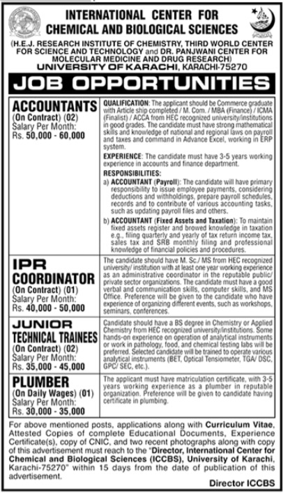International Center For Chemical & Biological Sciences Karachi, karachi Sindh Pakistan invites applications from eligible candidates for the post of plumber, accountant, technical trainees and ipr coordinator as per advertisement of March 31, 2023 published in daily Jang Newspaper. Preferred Education is MBA, M.com, MS, ACCA, M.sc and Middle etc.