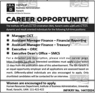 Institute of Business Administration IBA Karachi, karachi Sindh Pakistan invites applications from eligible candidates for the post of executive deans office, manager cict, executive oric and assistant manager finance as per advertisement of May 13, 2024 published in daily Kawish Newspaper. Preferred Education is Bachelor, Others and Master etc.