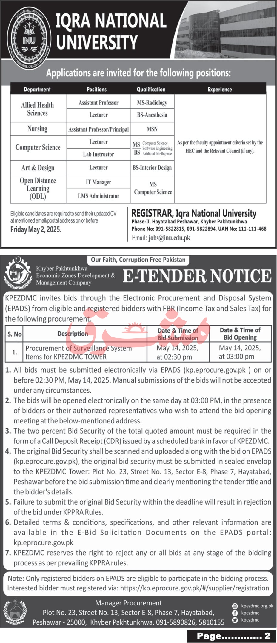 Apply at Iqra National University latest Private jobs in Management and departments before closing date which is around May 2, 2025 or as per closing date in newspaper ad. Read complete ad online to know how to apply on latest Iqra National University job opportunities.
