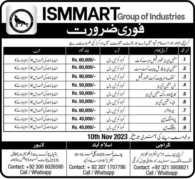 Vacant posts including pressing man, button machine operator, kaaj overlock machine operator, cutting master, packing man, shalwar kameez machine operator, pant coat machine operator, fedo machine operator and supervisor are announced in ISMMART Group of Industries Karachi, lahore, karachi and islamabad Sindh Pakistan as per 31 October 2023 advertisement in daily Express Newspaper. Intermediate, Bachelor, Matric and Master etc. educational qualification will be preferred.