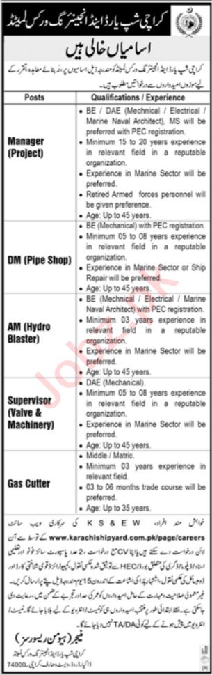 Vacant posts including dm pipe shop, supervisor valve machinery, am hydro blaster, gas cutter and manager project are announced in Karachi Shipyard and Engineering Works Limited Karachi, karachi Sindh Pakistan as per 30 October 2022 advertisement in daily Jang Newspaper. Candidates with Bachelor, Matric, Middle, B.E and DAE etc. educational background will be preferred.