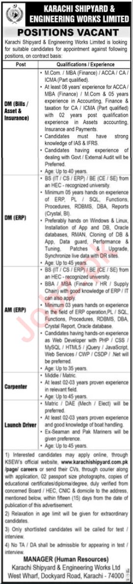 Vacant posts including deputy manager dm bills asset insurance, carpenter, launch driver, deputy manager dm erp and assistant manager am erp are announced in Karachi Shipyard and Engineering Works Limited Karachi, karachi Sindh Pakistan as per 24 September 2023 advertisement in daily Jang Newspaper. Candidates with BCS, M.com, BIT, MBA, CA, Matric, DAE, ACCA, B.E and Middle etc. educational background will be preferred.
