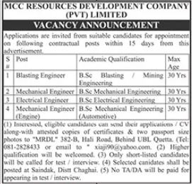 MCC Resources Development Company jobs advertisement dated about 29 June 2024 in daily Jang Newspaper invites application for the vacant post of mechanical engineer, mechanical engineer engine, electrical engineer and blasting engineer in Quetta, quetta Balochistan Pakistan. Bachelor etc. educational qualification will be preferred.