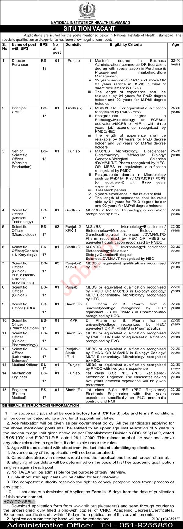 Vacant posts including scientific officer public health, scientific officer pharmaceutical, scientific officer vaccine production, scientific officer medical technology, engineer electro medical, scientific officer microbiology, principal cmlt, mechanical engineer, scientific officer genetic karyology, scientific officer phramacology, scientific officer laboratory sciences, scientific officer disease surveillance, scientific offcer ors, medical officer, director purchase and scientific officer clinical are announced in National Institute of Health NIH Islamabad, islamabad Islamabad Pakistan as per 10 December 2023 advertisement in daily Nawaiwaqt Newspaper. Candidates with Master, M.sc, B.E and MBBS etc. educational background will be preferred.