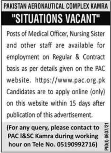 Apply at Pakistan Aeronautical Complex latest Government jobs in Medical and departments before closing date which is around June 24, 2022 or as per closing date in newspaper ad. Read complete ad online to know how to apply on latest Pakistan Aeronautical Complex job opportunities.