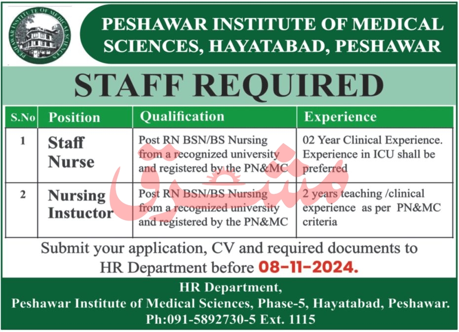 Peshawar Institute of Medical Sciences is looking for candidates for following posts as per job advertisement published in daily Mashriq Newspaper of November 1, 2024 for location Peshawar, peshawar Khyber Pakhtunkhwa KPK Pakistan: