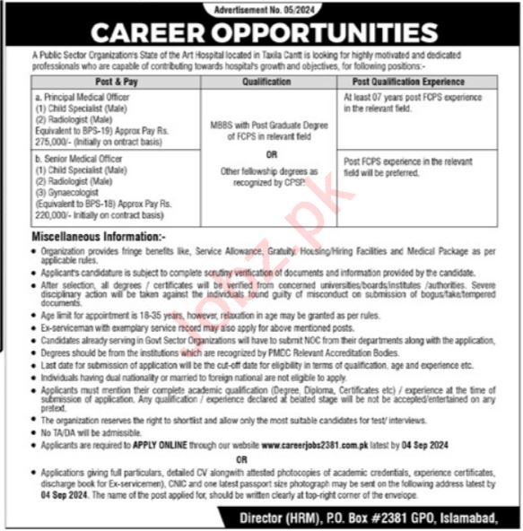 Public Sector Hospital is looking for candidates for following posts as per job advertisement published in daily Khabrain Newspaper of August 19, 2024 for location Islamabad, islamabad Islamabad Pakistan: