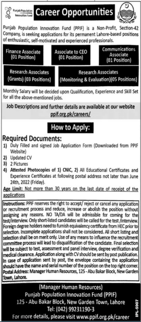 Punjab Population Innovation Fund PPIF Lahore, lahore Punjab Pakistan invites applications from eligible candidates for the post of communication associate, research associate grants, finance associate, research associate monitoring evaluation and associate to ceo as per advertisement of June 8, 2022 published in daily Jang Newspaper. Educational qualifications required Master and Bachelor etc.