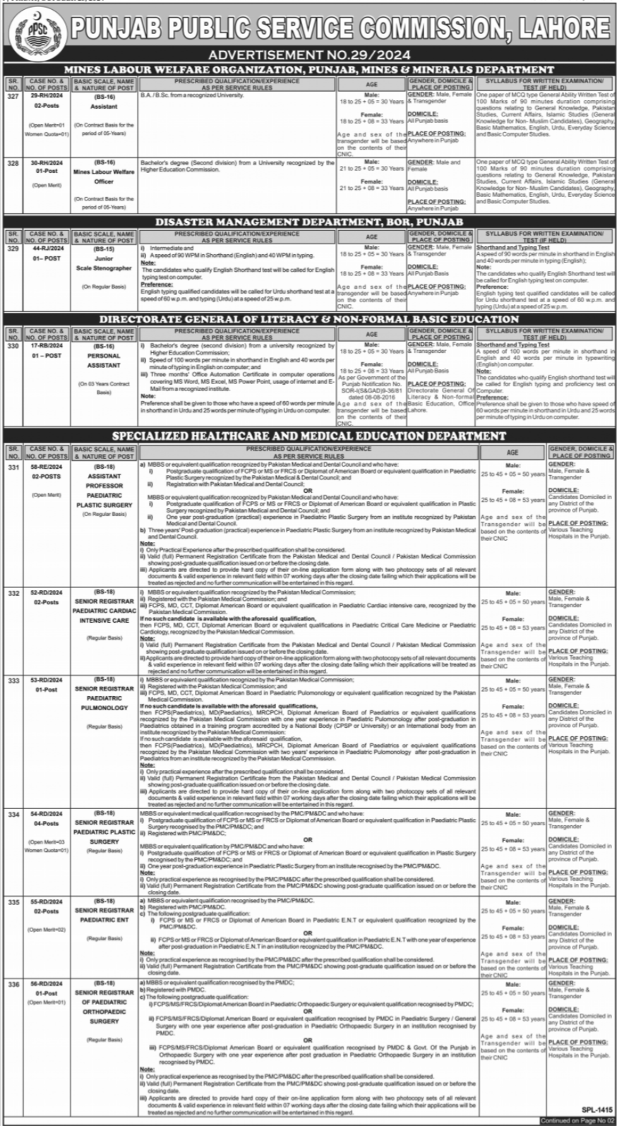 Vacant posts including Assistant Professor Paediatric Plastic Surgery, Registrar Ent, Registrar Paediatric Pulmonology, Registrar Of Paediatric Orthopaedic Surgery, Personal Assistant, Registrar Paediatric Ent, Registrar Paediatric Radiology, Statistical Officer, Mines Labour Welfare Officer, Registrar Paediatric Plastic Surgery, Stenographer, Assistant Head Clerk, Assistant and Registrar Paediatric Cardiac Intensive Care are announced in Punjab Public Service Commission PPSC Lahore, lahore Punjab Pakistan as per 26 October 2024 advertisement in daily Express Tribune Newspaper. Intermediate, Master, MBBS, Bachelor and BA etc. educational qualification will be preferred.