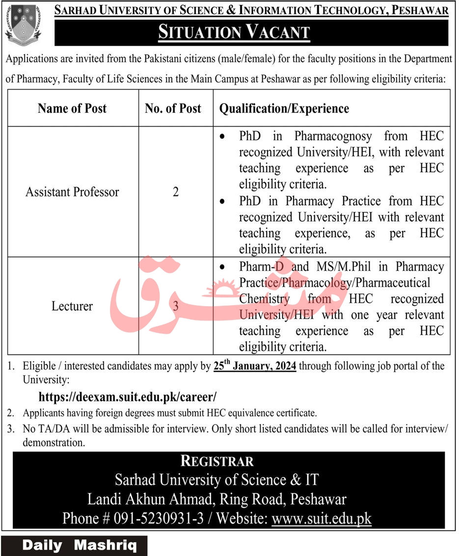 Sarhad University of Science & Information Technology jobs advertisement dated about 13 January 2024 in daily Mashriq Newspaper invites application for the vacant post of assistant professor and lecturer in Peshawar, peshawar Khyber Pakhtunkhwa KPK Pakistan. Persons with Phd, MS, Mphil and Pharma D etc. education can apply.