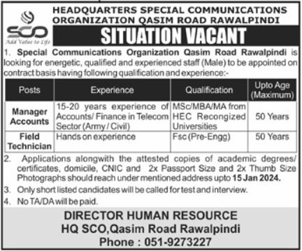 Vacant posts including field technician and manager accounts are announced in Special Communications Organization SCO Rawalpindi, rawalpindi Punjab Pakistan as per 29 December 2023 advertisement in daily Khabrain Newspaper. Candidates with MBA, M.sc and MA etc. educational background will be preferred.