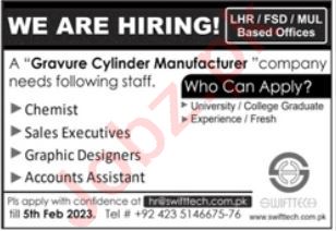 Swifttech Pvt Ltd Lahore, lahore Punjab Pakistan invites applications from eligible candidates for the post of sales executive, accounts assistant, graphic designer and chemist as per advertisement of January 22, 2023 published in daily Jang Newspaper. Master and Bachelor etc. educational qualification will be preferred.