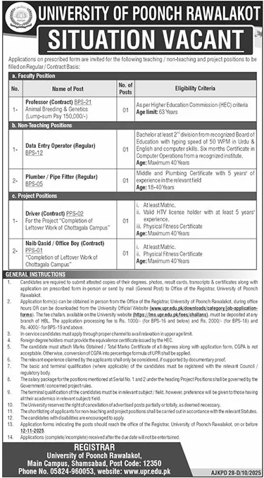 The University of Poonch Rawalakot jobs advertisement dated about 25 October 2025 in daily The News Newspaper invites application for the vacant post of data entry operator, plumber, office boy, professor, naib qasid, pipe fitter and driver in Rawalakot, rawalakot AJK Pakistan. Candidates with Mphil, Bachelor and Matric etc. educational background will be preferred.