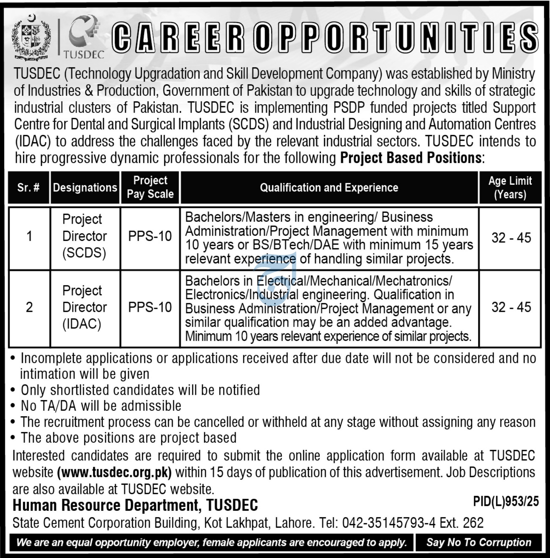 Technology Upgradation and Skill Development Company TUSDEC jobs advertisement dated about 12 October 2025 in daily Aaj Newspaper invites application for the vacant post of project director in Kot Lakhpat Lahore, lahore Punjab Pakistan. Persons with Bachelor and Master etc. education can apply.