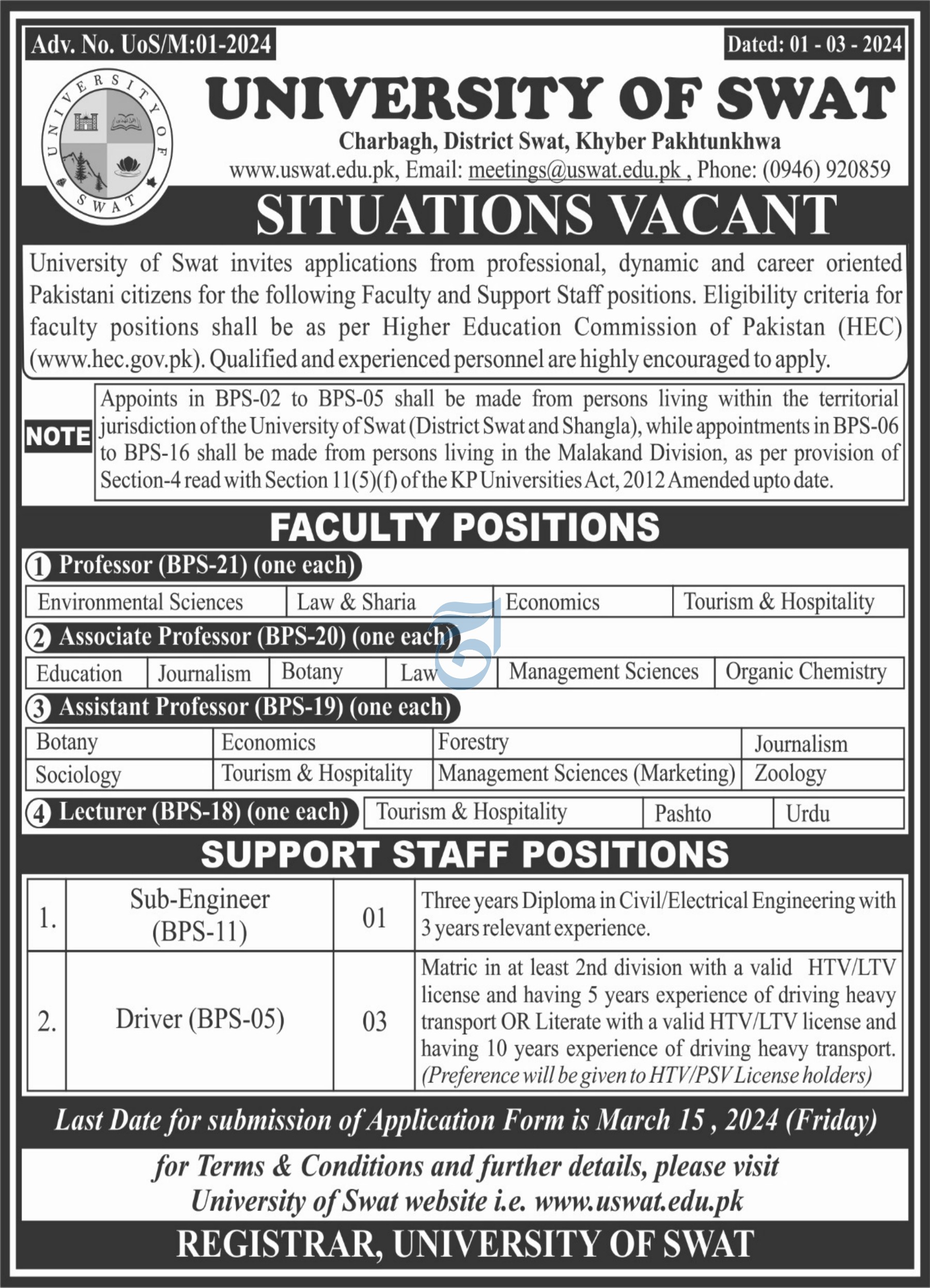 University of Swat jobs advertisement dated about 1 March 2024 in daily Aaj Newspaper invites application for the vacant post of professor, sub engineer, assistant professor, lecturer, driver and associate professor in Swat, swat Khyber Pakhtunkhwa KPK Pakistan. Persons with MS, Mphil, DAE, Phd and Matric etc. education can apply.