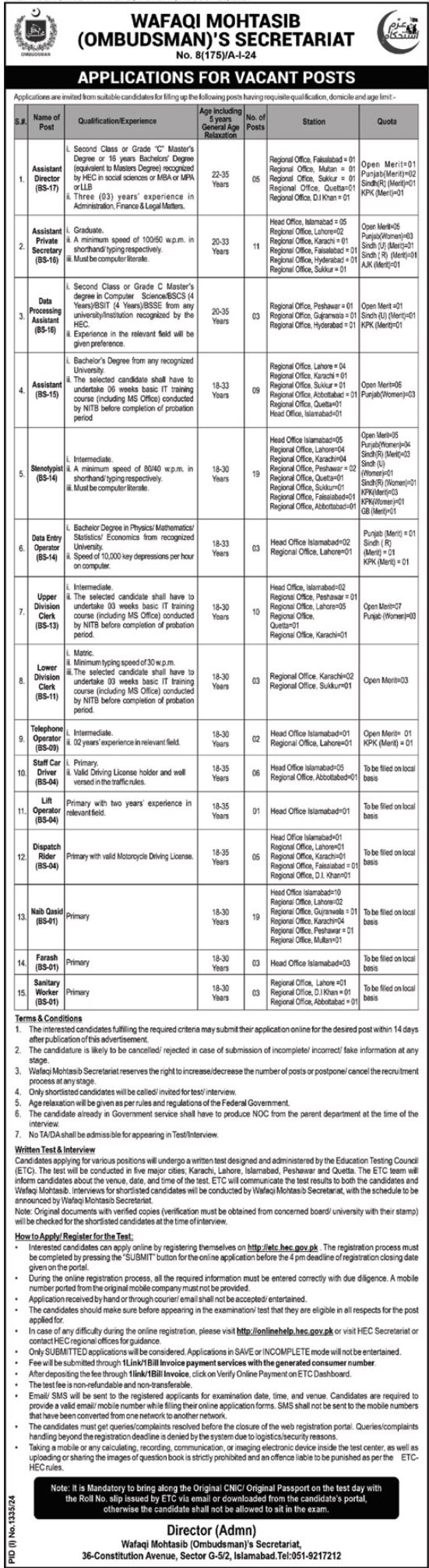 Wafaqi Mohtasib Ombudsman Secretariat jobs advertisement dated about 27 August 2024 in daily Ausaf Newspaper invites application for the vacant post of assistant, telephone operator, sanitary worker, stenotypist, lift operator, staff car driver, assistant private secretary, data entry operator, data processing assistant, dispatch rider, upper division clerk, assistant director, farash, naib qasid and lower division clerk in Islamabad, islamabad Islamabad Pakistan. Educational qualifications required Matric, Primary, Master, Bachelor, LLb and Intermediate etc.