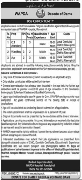 Vacant posts including ward boy, aya and ot attendant are announced in Wapda Hospital Rawalpindi, rawalpindi Punjab Pakistan as per 12 December 2022 advertisement in daily Nawaiwaqt Newspaper. Candidates with Matric and Middle etc. educational background will be preferred.