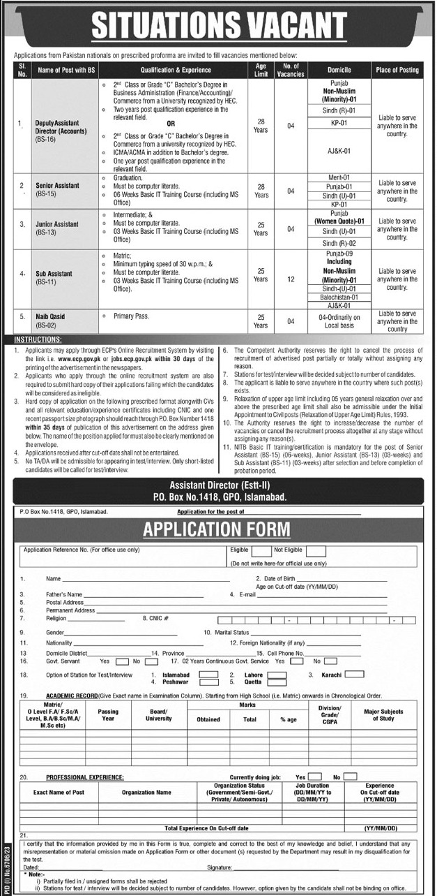 Election Commission of Pakistan ECP jobs advertisement dated about 8 May 2024 in daily Ausaf Newspaper invites application for the vacant post of aassistant, niab qasid and deputy assistant director in Islamabad, islamabad Islamabad Pakistan. Preferred Education is Bachelor, Intermediate, Matric, B.com, Middle and BA etc.