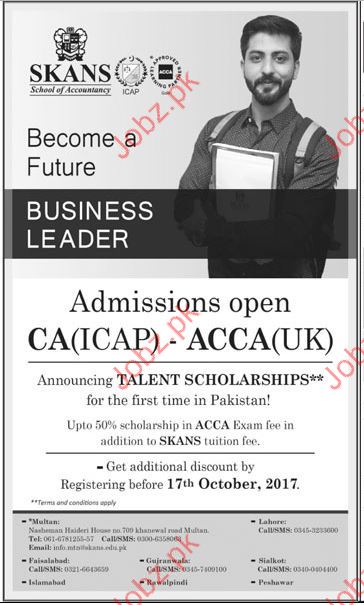 Skans School Of Accountancy has been open admissions for ACCA, CA, ICAP. Skans announced talent Scholarships for the frist time ion Pakistan Upto 50% Scholarship Given in ACCA Exams Fee in addition to SKANS Tution Fee. Read newspaper ad for exact details.
