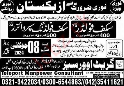 Teleport Manpower Consultants is looking for candidates for following posts as per job advertisement published in daily Express Newspaper of July 7, 2024 for location Tashkent, tashkent Uzbekistan: