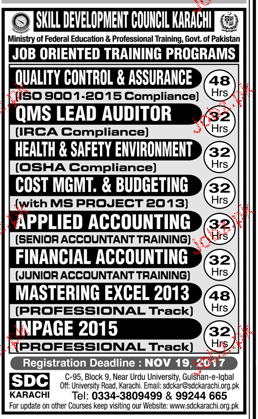 Skill Development Council Admission in Courses in Quality Control & Assurance. QMS Lead Auditors, Health & Safety Environment and Applied Accounting in Karachi. Read newspaper ad for exact details.