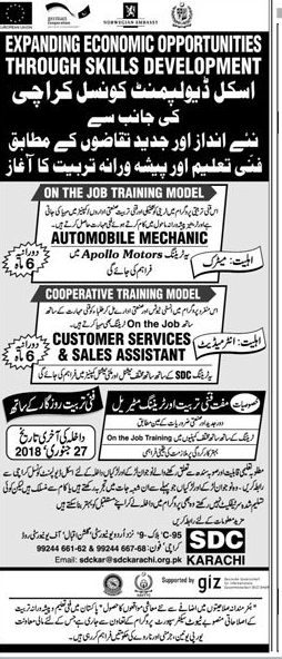 Skill Development Council Admission in Diplomas in Automobile Mechanics, Cooperative Training Model and Other Courses in Karachi. Last date for submission of admission forms is 27-01-2018. Read newspaper ad for exact details.