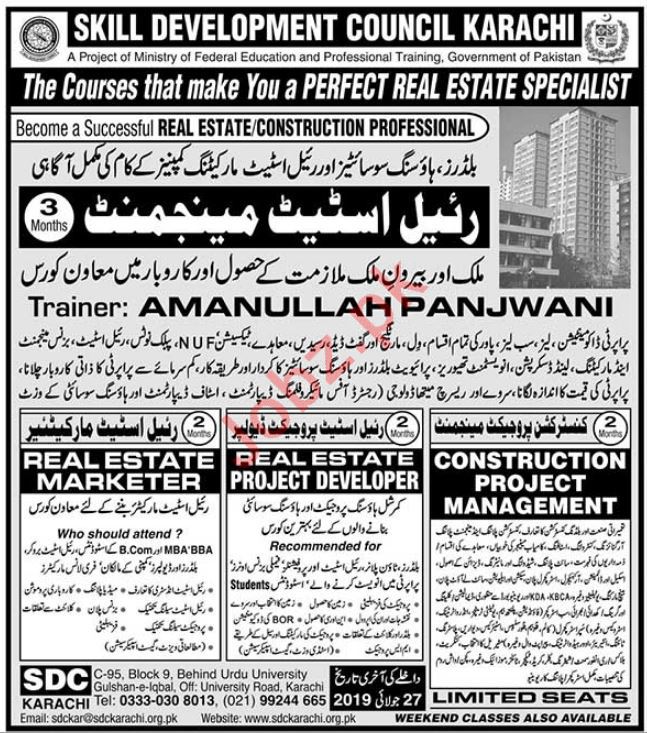 Skill Development Council SDC Karachi, Pakistan are announcing admissions fall 2019 for the classes of Professional Construction Diploma in Real Estate Management. Read newspaper ad for exact details.