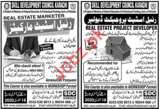 Skill development Council SDC invites application for Admissions 2020 for the Course of Real Estate Marketer, Real Estate Project Developer in Karachi. All Student submit their admissions form before deadline. Read newspaper ad for exact details.