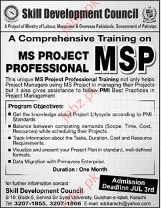 MS Project Professional Training in Skill Development Council Karachi Offering Professional Courses Read newspaper ad for exact details.