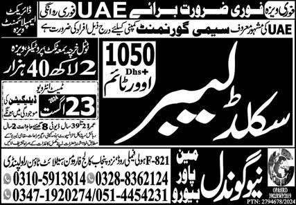 New Gondal Manpower Bureau jobs advertisement dated about 21 August 2024 in daily Express Newspaper invites application for the vacant post of skilled labor in Abu Dhabi, abu dhabi UAE. Preferred Education is Middle etc.