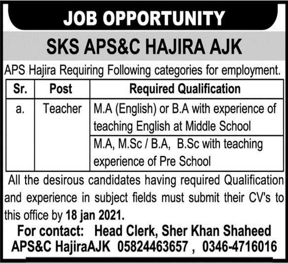 SKS APS&C Hajira Teaching Staff Jobs 2021