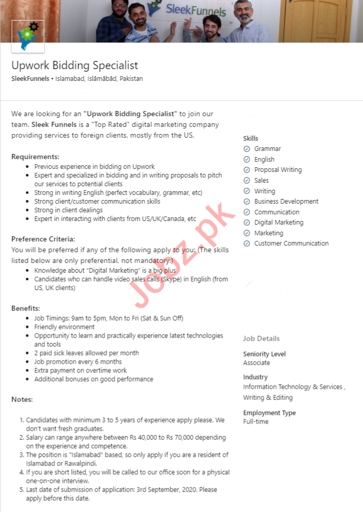 Sleek Funnels Islamabad Jobs 2020 Upwork Bidding Specialist