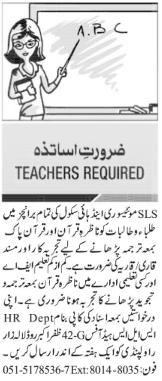 Latest SLS Montessori & School Teaching Posts Rawalpindi 2025