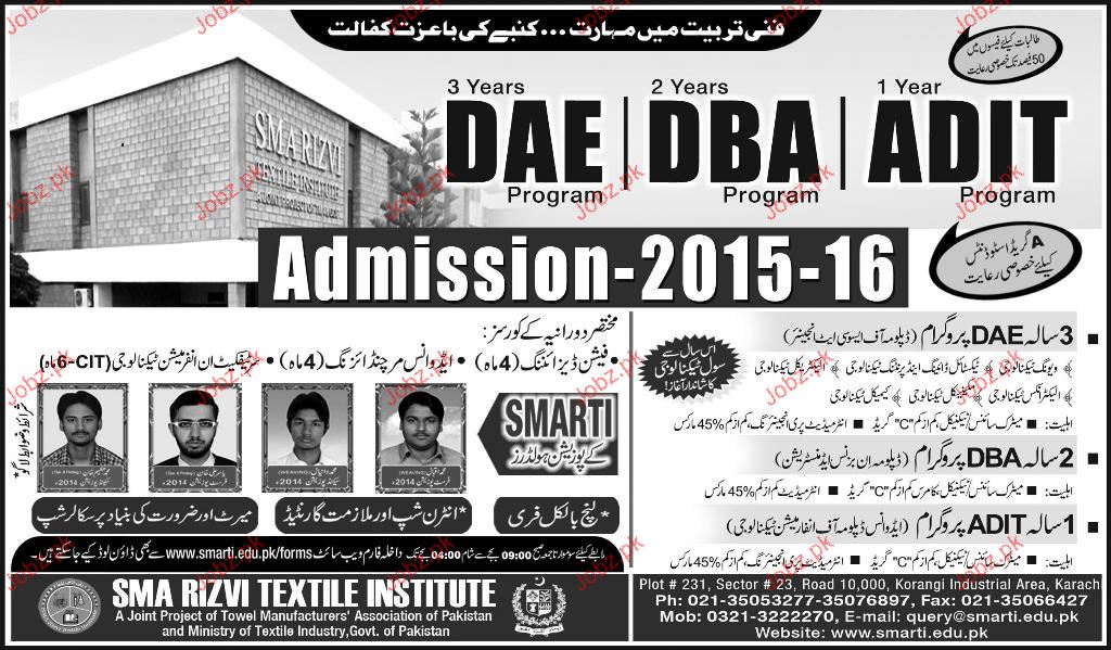 SMA RizVi Textile Institute Admission in DAE, DBA and ADIT in Lahore. Read newspaper ad for exact details.