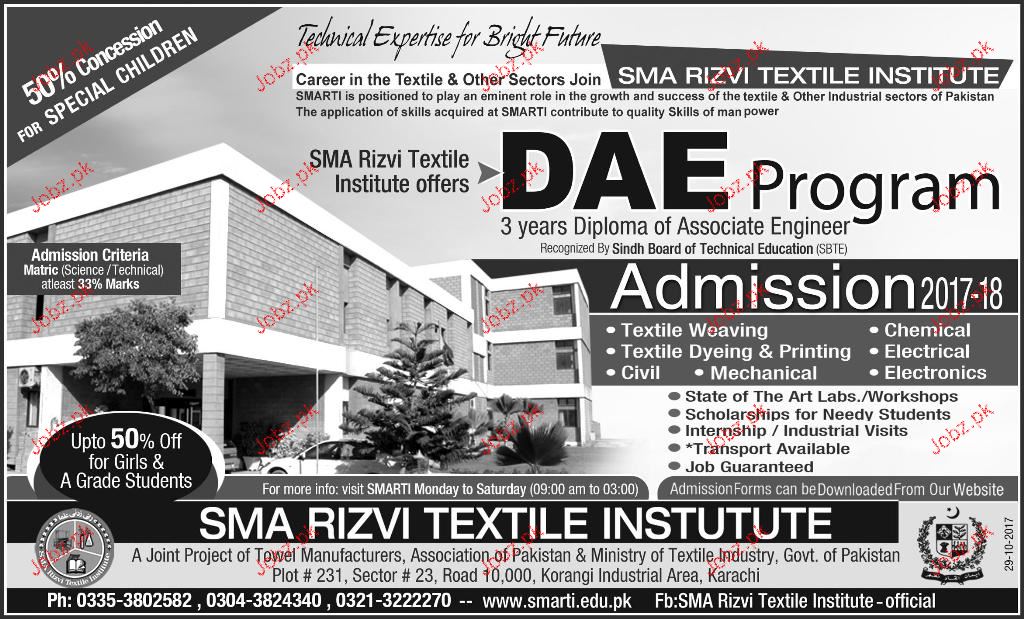 SMA Rizvi Textile Institute Admission in DAE Programs 3 Year Diploma of Associate Engineer in Textile Weaving, Chemical and Mechanical recognized by Sindh Board of Technical Education in Karachi. Read newspaper ad for exact details.