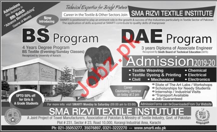 SMA Rizvi Textile Institute is offering admissions in BS Textile, Diploma of Associate Engineering in Textile Waving, Textile Dyeing & printing, Civil, Mechanical, Chemical, Electrical, Electronics in Karachi. Read newspaper ad for exact details.