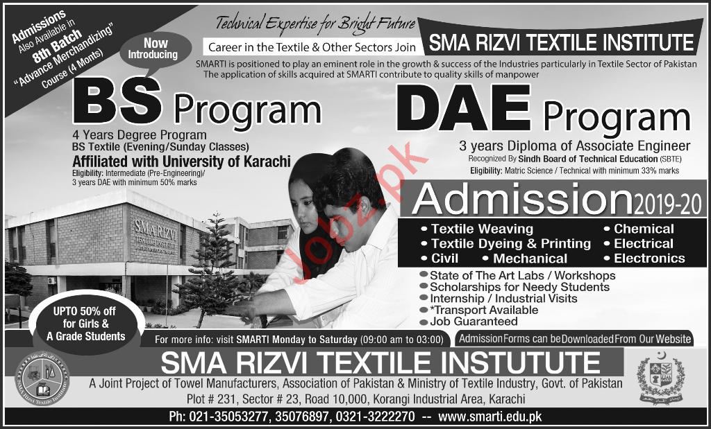 SMA Rizvi Textile Institute has announced admissions in BS Textile, Diploma of Associate Engineering DAE in Textile Weaving, Textile Dyeing and Printing, Civil, Mechanical, Chemical, Electrical, Electronics in Karachi. SMA Rizvi Textile Institute is affiliated with SBTE and A joint Project of Towel Manufacturers, Association of Pakistan and Ministry of Textile Industry, Government of Pakistan. Read newspaper ad for exact details.