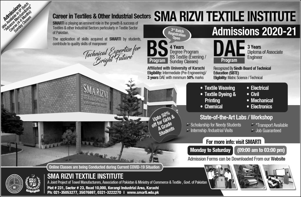SMA Rizvi Textile Institute A Joint Project of Towel Manufacturers, Association of Pakistan & Ministry of Commerce & Textile Government of Pakistan invited applications for admissions in BS Programs & Diploma of Associate Engineer DAE Programs in Karachi Sindh Pakistan. Read newspaper ad for exact details.